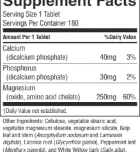 250 mg of magnesium (magnesium oxide and magnesium acid chelate), licorice root, kelp leaf and stem, peppermint leaves and white willow bark.